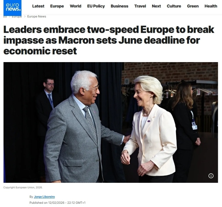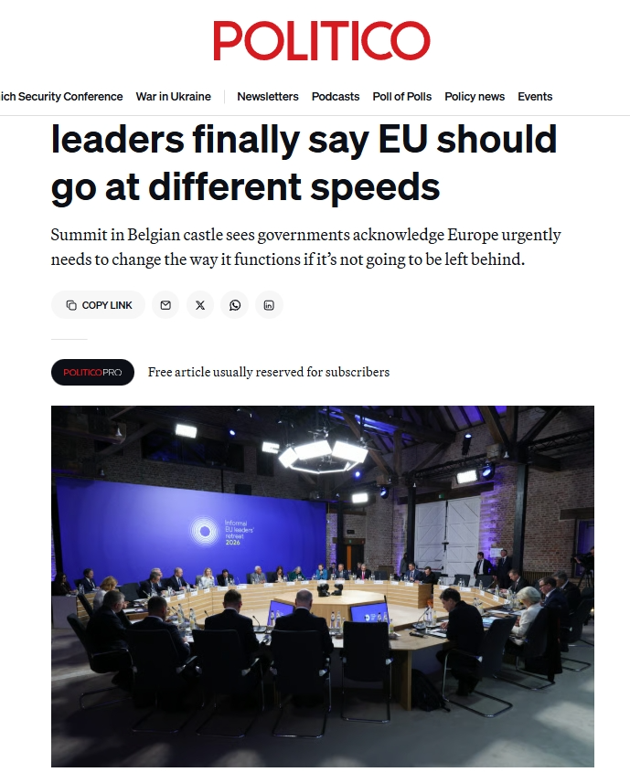 《政治報(bào)》網(wǎng)站歐洲版的報(bào)道評論稱,歐盟一直以其成員國團(tuán)結(jié)一致向前邁進(jìn)而自豪,那個(gè)時(shí)代已經(jīng)結(jié)束了。2月12日在比利時(shí)舉行的會(huì)議上,法國、德國、意大利等多國領(lǐng)導(dǎo)人支持,最早將于下個(gè)月的歐洲理事會(huì)上形成一項(xiàng)計(jì)劃,以簽署組成更小團(tuán)體的倡議。各國政府表示,由于歐洲的許多想法陷入優(yōu)柔寡斷和不和諧之中,歐洲的競爭優(yōu)勢正在逐漸消失,因此他們感到一種緊迫感。