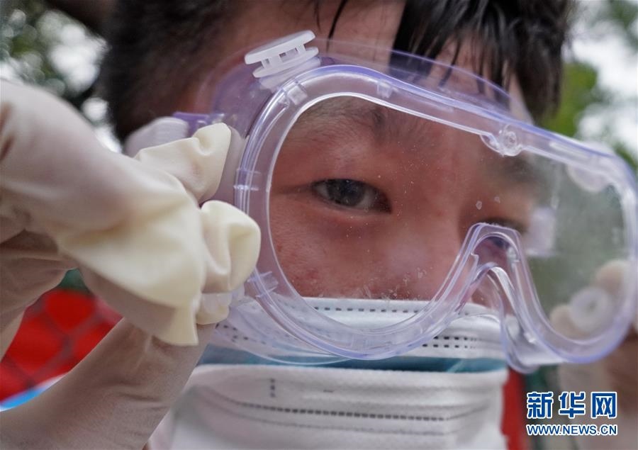 豐臺(tái)區(qū)東高地街道社區(qū)衛(wèi)生服務(wù)中心一位醫(yī)護(hù)人員的護(hù)目鏡內(nèi)流進(jìn)了汗水(6月15日攝)。連日來(lái),北京出現(xiàn)高溫天氣??崾钪校ぷ魅藛T堅(jiān)守抗擊疫情一線,成為烈日下的“逆行者”。新華社記者李欣攝