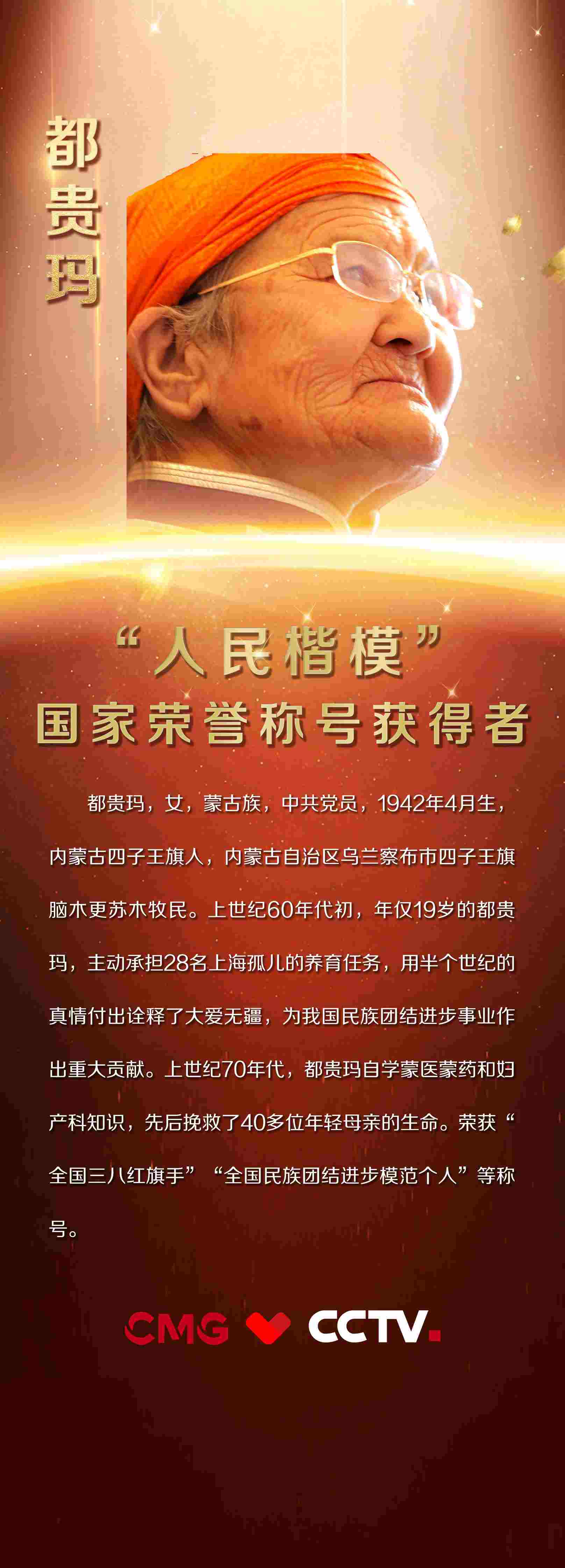 都貴瑪,女,蒙古族,中共黨員,1942年4月生,內(nèi)蒙古四子王旗人,內(nèi)蒙古自治區(qū)烏蘭察布市四子王旗腦木更蘇木牧民。上世紀(jì)60年代初,年僅19歲的都貴瑪,主動承擔(dān)28名上海孤兒的養(yǎng)育任務(wù),用半個世紀(jì)的真情付出詮釋了大愛無疆,為我國民族團(tuán)結(jié)進(jìn)步事業(yè)作出重大貢獻(xiàn)。上世紀(jì)70年代,都貴瑪自學(xué)蒙醫(yī)蒙藥和婦產(chǎn)科知識,先后挽救了40多位年輕母親的生命。榮獲“全國三八紅旗手”“全國民族團(tuán)結(jié)進(jìn)步模范個人”等稱號。