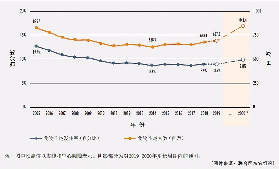 全球食物不足發(fā)生率及人數(shù)逐年統(tǒng)計(jì)和預(yù)測圖(圖片來源:聯(lián)合國糧農(nóng)組織)
