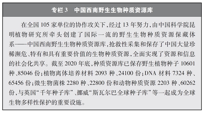 加快重要生物遺傳資源收集保存和利用。中國(guó)高度重視生物資源保護(hù),近年來(lái)在生物資源調(diào)查、收集、保存等方面取得較大進(jìn)展。實(shí)施戰(zhàn)略生物資源計(jì)劃專(zhuān)項(xiàng),完善生物資源收集收藏平臺(tái),建立種質(zhì)資源創(chuàng)新平臺(tái)、遺傳資源衍生庫(kù)和天然化合物轉(zhuǎn)化平臺(tái),持續(xù)加強(qiáng)野生生物資源保護(hù)和利用。實(shí)施一批種質(zhì)資源保護(hù)和育種創(chuàng)新項(xiàng)目,截至2020年底,形成了以國(guó)家作物種質(zhì)長(zhǎng)期庫(kù)及其復(fù)份庫(kù)為核心、10座中期庫(kù)與43個(gè)種質(zhì)圃為支撐的國(guó)家作物種質(zhì)資源保護(hù)體系,建立了199個(gè)國(guó)家級(jí)畜禽遺傳資源保種場(chǎng)(區(qū)、庫(kù)),為90%以上的國(guó)家級(jí)畜禽遺傳資源保護(hù)名錄品種建立了國(guó)家級(jí)保種單位,長(zhǎng)期保存作物種質(zhì)資源52萬(wàn)余份、畜禽遺傳資源96萬(wàn)份。建設(shè)99個(gè)國(guó)家級(jí)林木種質(zhì)資源保存庫(kù),以及新疆、山東2個(gè)國(guó)家級(jí)林草種質(zhì)資源設(shè)施保存庫(kù)國(guó)家分庫(kù),保存林木種質(zhì)資源4.7萬(wàn)份。建設(shè)31個(gè)藥用植物種質(zhì)資源保存圃和2個(gè)種質(zhì)資源庫(kù),保存種子種苗1.2萬(wàn)多份。