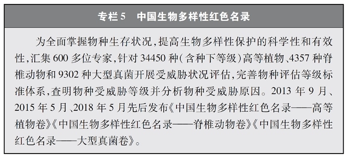 開(kāi)展全國(guó)生物多樣性調(diào)查與評(píng)估。大力推進(jìn)生物多樣性保護(hù)重大工程實(shí)施,結(jié)合自然資源調(diào)查、生態(tài)系統(tǒng)監(jiān)測(cè)評(píng)估等工作,不斷完善生物多樣性調(diào)查與評(píng)估能力,首次將生物多樣性指標(biāo)納入生態(tài)質(zhì)量綜合評(píng)價(jià)指標(biāo)體系,引導(dǎo)地方加強(qiáng)生態(tài)文明建設(shè)與生物多樣性保護(hù)。開(kāi)展自然資源調(diào)查,包括森林、草原、水、濕地、荒漠、海洋等,建立自然資源調(diào)查評(píng)價(jià)監(jiān)測(cè)制度。構(gòu)建了涵蓋2376個(gè)縣級(jí)行政單元、樣線總長(zhǎng)超過(guò)3.4萬(wàn)公里的物種分布數(shù)據(jù)庫(kù),建立物種資源調(diào)查及收集信息平臺(tái),準(zhǔn)確反映野生動(dòng)植物空間分布狀況。完成長(zhǎng)江經(jīng)濟(jì)帶、京津冀等國(guó)家戰(zhàn)略區(qū)域180多個(gè)縣級(jí)行政區(qū)生物多樣性調(diào)查與評(píng)估。組織開(kāi)展近海漁業(yè)資源調(diào)查,初步掌握近海漁業(yè)資源狀況。陸續(xù)發(fā)布《中國(guó)植物紅皮書(shū)》《中國(guó)瀕危動(dòng)物紅皮書(shū)》《中國(guó)物種紅色名錄》《中國(guó)生物多樣性紅色名錄》,基本掌握生物多樣性總體情況,為加強(qiáng)生物多樣性保護(hù)奠定了科學(xué)基礎(chǔ)。
