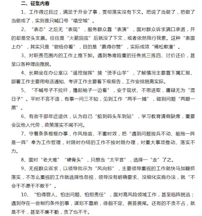 “躺平式干部”線索的征集包括10個(gè)方面,例如,“工作得過且過,滿足于開會(huì)了事”,“‘表態(tài)’之后無‘表現(xiàn)’,服務(wù)群眾靠‘表演’”,“平時(shí)不言不語(yǔ),有事一問三不知”,等等。