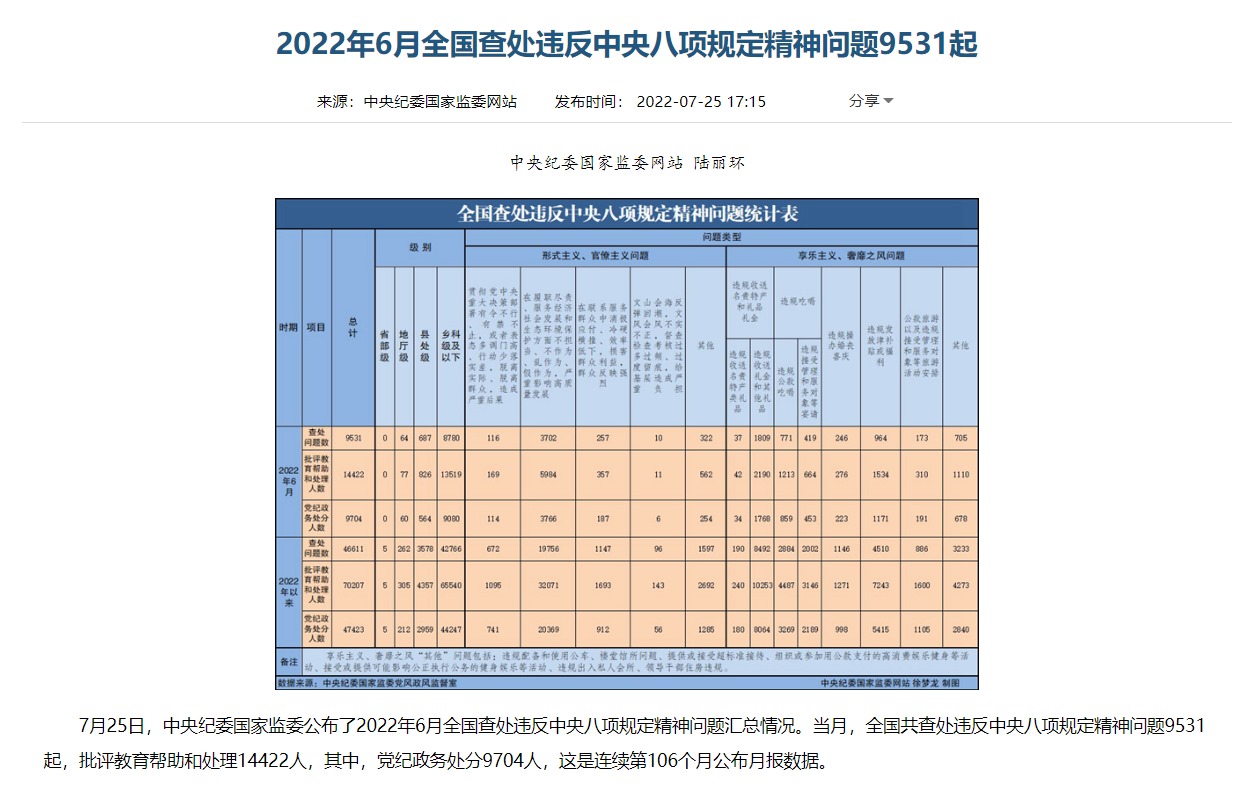 中國共產黨新聞網北京7月25日電(彭靜)7月25日,中央紀委國家監(jiān)委在其官方網站公布了2022年6月全國查處違反中央八項規(guī)定精神問題匯總情況,這是連續(xù)第106個月公布月報數據。