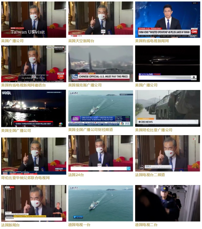 總臺國際視頻通訊社聚焦外交部、國臺辦、東部戰(zhàn)區(qū)等權(quán)威表態(tài),可視化制作編發(fā)《國際銳評》《玉淵譚天》等相關(guān)評論言論。截至8月4日10時,共有84條新聞素材得到BBC、CNN、CNBC、英國天空新聞臺、法國24臺、法國電視臺、法國新聞臺、德國電視一臺、德國電視二臺、德國之聲、意大利廣播電視公司、意大利TGCOM24電視臺、加拿大廣播公司、加拿大最大的商業(yè)電視網(wǎng)CTV、俄羅斯第一頻道、全俄國家電視廣播公司、日本NHK、韓國KBS、巴西環(huán)球電視臺、印度國家電視臺、新加坡亞洲新聞臺、澳大利亞廣播公司、卡塔爾半島電視臺、墨西哥阿茲特克電視臺、印尼國家廣播電視臺等102個國家和地區(qū)的1683個電視臺及新媒體平臺采用。國際視頻通訊社還特別面向中國臺灣地區(qū)的媒體進(jìn)行精準(zhǔn)投送,實(shí)現(xiàn)臺灣地區(qū)主流電視臺全覆蓋,落地效果突出:臺灣東森電視臺、臺灣無線衛(wèi)星電視臺(TVBS)、臺灣中華電視臺、臺灣中天電視臺等共有13個臺灣電視臺及采用播出744次,播出總時長3小時26分44秒。