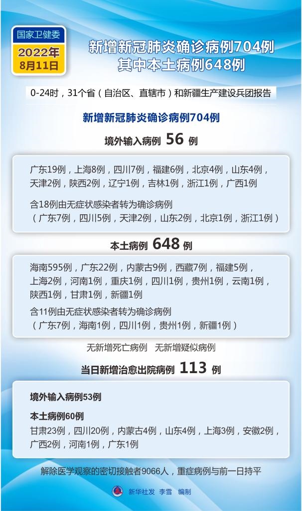 新華社北京8月12日電 國(guó)家衛(wèi)生健康委員會(huì)8月12日通報(bào),8月11日0—24時(shí),31個(gè)省(自治區(qū)、直轄市)和新疆生產(chǎn)建設(shè)兵團(tuán)報(bào)告新增確診病例704例。其中境外輸入病例56例(廣東19例,上海8例,四川7例,福建6例,北京4例,山東4例,天津2例,陜西2例,遼寧1例,吉林1例,浙江1例,廣西1例),含18例由無(wú)癥狀感染者轉(zhuǎn)為確診病例(廣東7例,四川5例,天津2例,山東2例,北京1例,浙江1例);本土病例648例(海南595例,廣東22例,內(nèi)蒙古9例,西藏7例,福建5例,上海2例,河南1例,重慶1例,四川1例,貴州1例,云南1例,陜西1例,甘肅1例,新疆1例),含11例由無(wú)癥狀感染者轉(zhuǎn)為確診病例(廣東7例,海南1例,四川1例,貴州1例,新疆1例)。無(wú)新增死亡病例。無(wú)新增疑似病例。