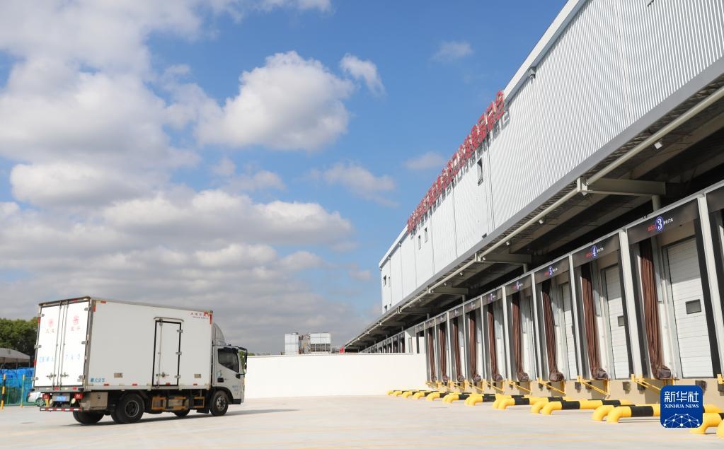 10月20日,裝載第一批進(jìn)口冷鏈?zhǔn)称氛蛊返目ㄜ?chē)駛?cè)肟倐}(cāng)卸貨區(qū)域。新華社記者 方喆攝