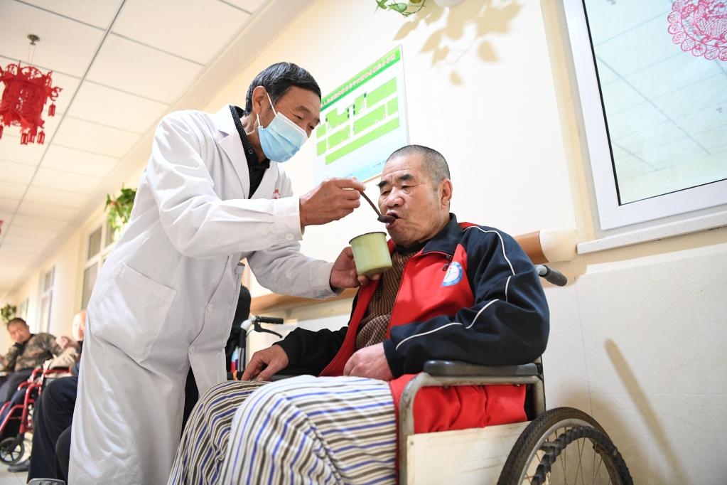 2021年12月28日,河北省景縣人民醫(yī)院醫(yī)養(yǎng)中心工作人員幫助老人喝水。新華社記者朱旭東攝