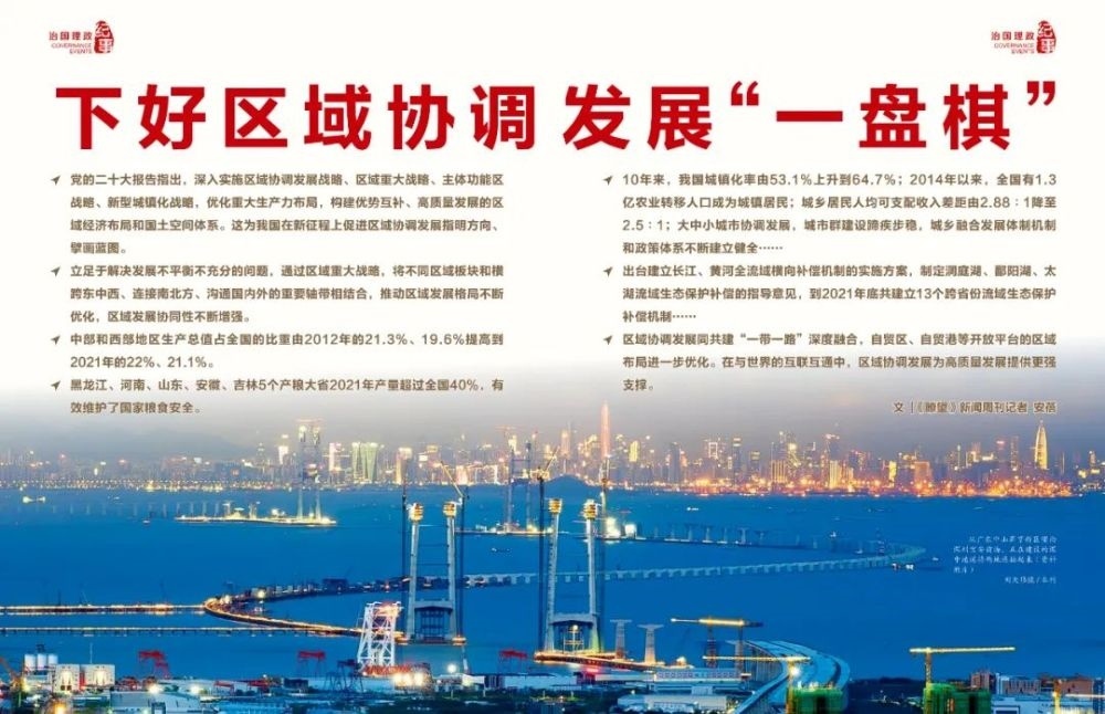 ◆ 黨的二十大報(bào)告指出,深入實(shí)施區(qū)域協(xié)調(diào)發(fā)展戰(zhàn)略、區(qū)域重大戰(zhàn)略、主體功能區(qū)戰(zhàn)略、新型城鎮(zhèn)化戰(zhàn)略,優(yōu)化重大生產(chǎn)力布局,構(gòu)建優(yōu)勢互補(bǔ)、高質(zhì)量發(fā)展的區(qū)域經(jīng)濟(jì)布局和國土空間體系。這為我國在新征程上促進(jìn)區(qū)域協(xié)調(diào)發(fā)展指明方向、擘畫藍(lán)圖。