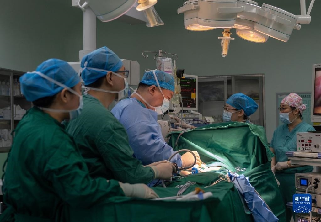 在北京市第六醫(yī)院的醫(yī)聯(lián)體胸外科病房手術(shù)室,北京協(xié)和醫(yī)院與北京市第六醫(yī)院的醫(yī)護(hù)人員進(jìn)行團(tuán)隊(duì)協(xié)作開展胸腔鏡手術(shù)(2021年6月3日攝)。新華社記者 才揚(yáng) 攝