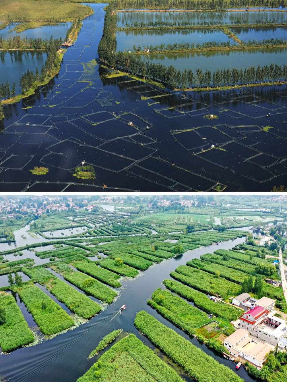 拼版照片:上圖為2012年9月29日拍攝的白洋淀(金潔 攝);下圖為2021年8月14日拍攝的白洋淀風(fēng)光(無人機(jī)照片,新華社記者牟宇攝)。