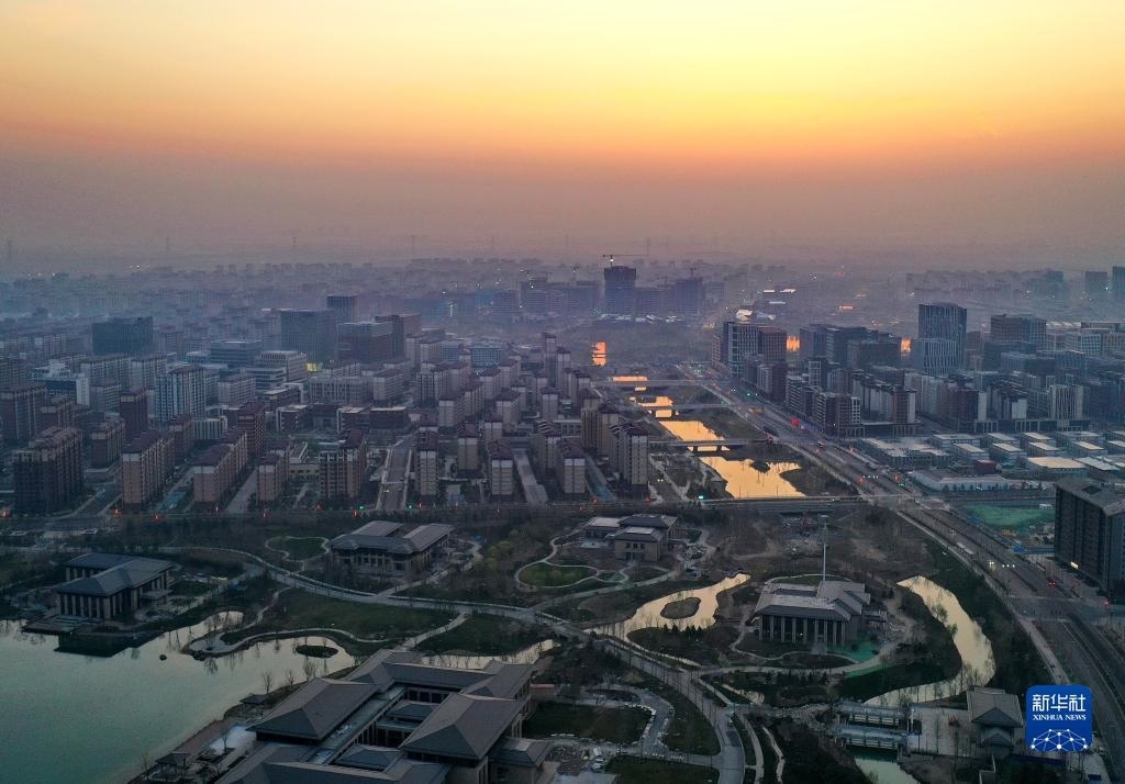 雄安新區(qū)容東片區(qū)內(nèi)的水系沐浴在晨光中(2023年3月31日攝,無(wú)人機(jī)照片)。新華社記者 牟宇 攝