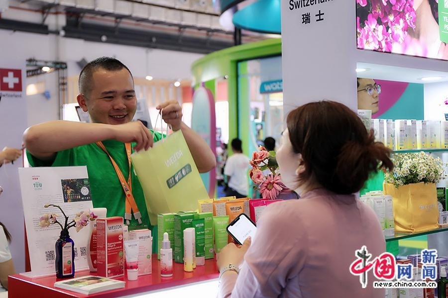 4月11日,工作人員為觀眾介紹瑞士護(hù)膚產(chǎn)品。中國網(wǎng)記者 吳亮 攝