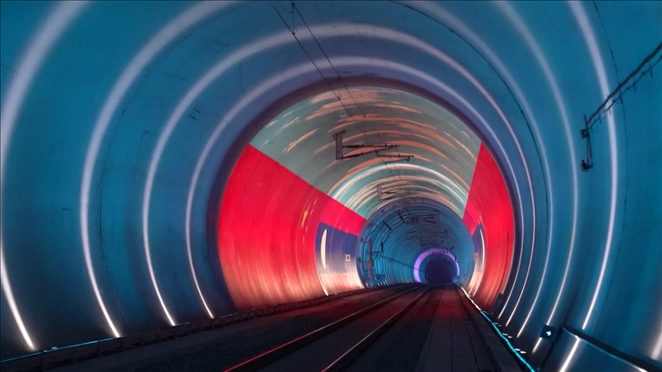 2023年4月9日,云南西雙版納,航拍中老鐵路友誼隧道,隧道內(nèi)各種燈光裝飾,隧道外墻畫展現(xiàn)文化特色。視覺中國