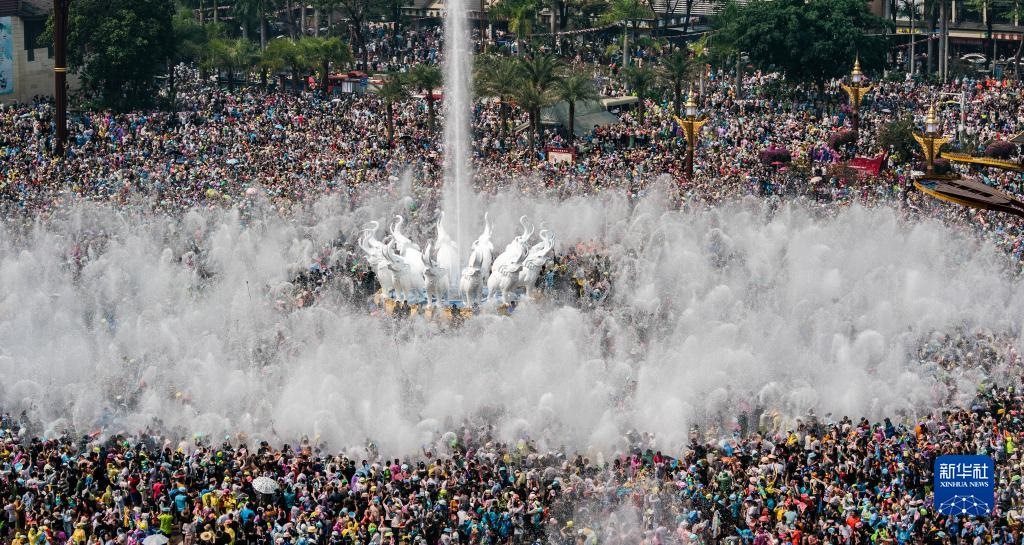 4月15日,人們在云南省西雙版納傣族自治州景洪市潑水廣場潑水狂歡。