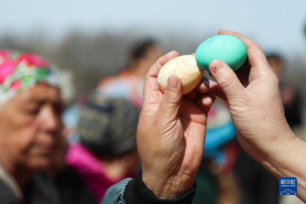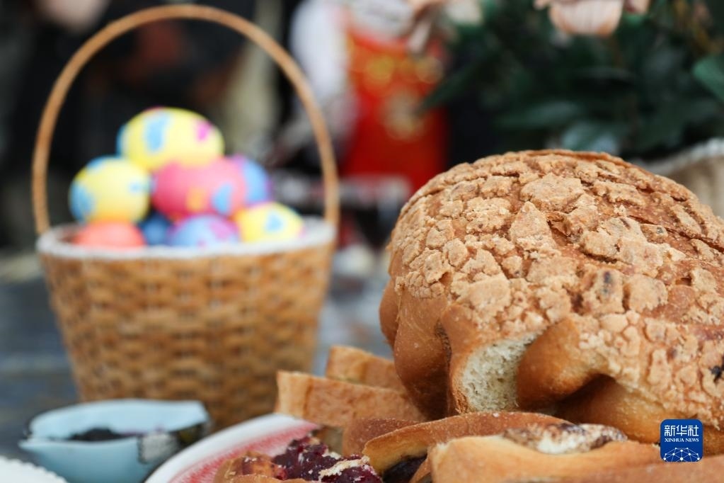 4月16日拍攝的當?shù)厝罕姙橛影退箍斯?jié)準備的美食和彩蛋。