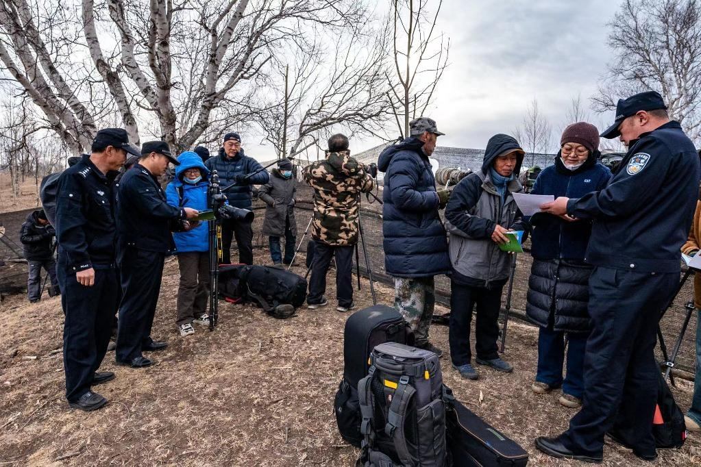 4月17日,民警在向攝影愛(ài)好者宣傳鳥(niǎo)類(lèi)保護(hù)知識(shí)。(宿海東 攝)