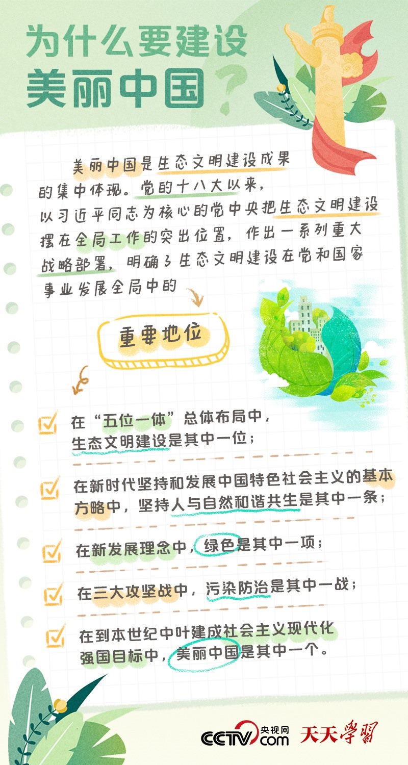 黨的十八大以來,以習(xí)近平同志為核心的黨中央以前所未有的力度抓生態(tài)文明建設(shè),全黨全國推動(dòng)綠色發(fā)展的自覺性和主動(dòng)性顯著增強(qiáng),美麗中國建設(shè)邁出重大步伐。黨的二十大為美麗中國建設(shè)擘畫新藍(lán)圖:我們要推進(jìn)美麗中國建設(shè),堅(jiān)持山水林田湖草沙一體化保護(hù)和系統(tǒng)治理,統(tǒng)籌產(chǎn)業(yè)結(jié)構(gòu)調(diào)整、污染治理、生態(tài)保護(hù)、應(yīng)對(duì)氣候變化,協(xié)同推進(jìn)降碳、減污、擴(kuò)綠、增長(zhǎng),推進(jìn)生態(tài)優(yōu)先、節(jié)約集約、綠色低碳發(fā)展。一個(gè)天藍(lán)、地綠、水清的美麗中國,漸行漸近。