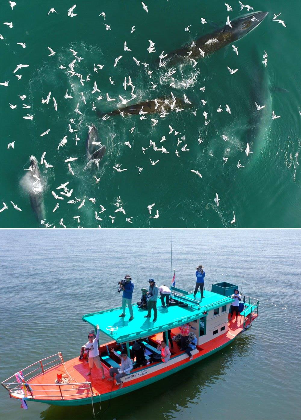 (拼版照片)上圖:布氏鯨在中國(guó)廣西潿洲島附近海域捕食(2022年2月22日攝)。下圖:中泰兩國(guó)科研人員在泰國(guó)灣對(duì)布氏鯨進(jìn)行聯(lián)合調(diào)查(2019年10月25日攝)。中泰兩國(guó)科研人員攜手研究保護(hù)布氏鯨這個(gè)近岸大型鯨類(lèi),圍繞布氏鯨調(diào)查技術(shù)、調(diào)查方法以及其他海洋哺乳動(dòng)物的研究和數(shù)據(jù)處理方法進(jìn)行交流與合作。