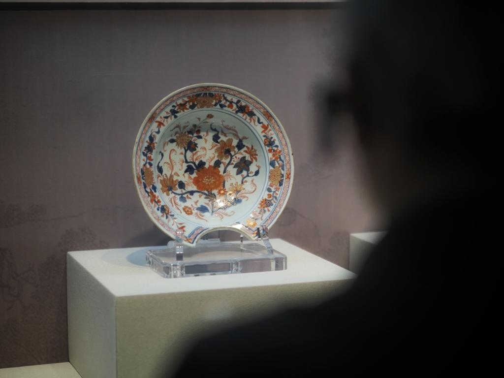 4月18日,在江西省景德鎮(zhèn)外銷瓷博物館,一名參觀者在欣賞清代康熙年間的青花礬紅描金蓮花紋剃須碗。新華社記者趙宇攝