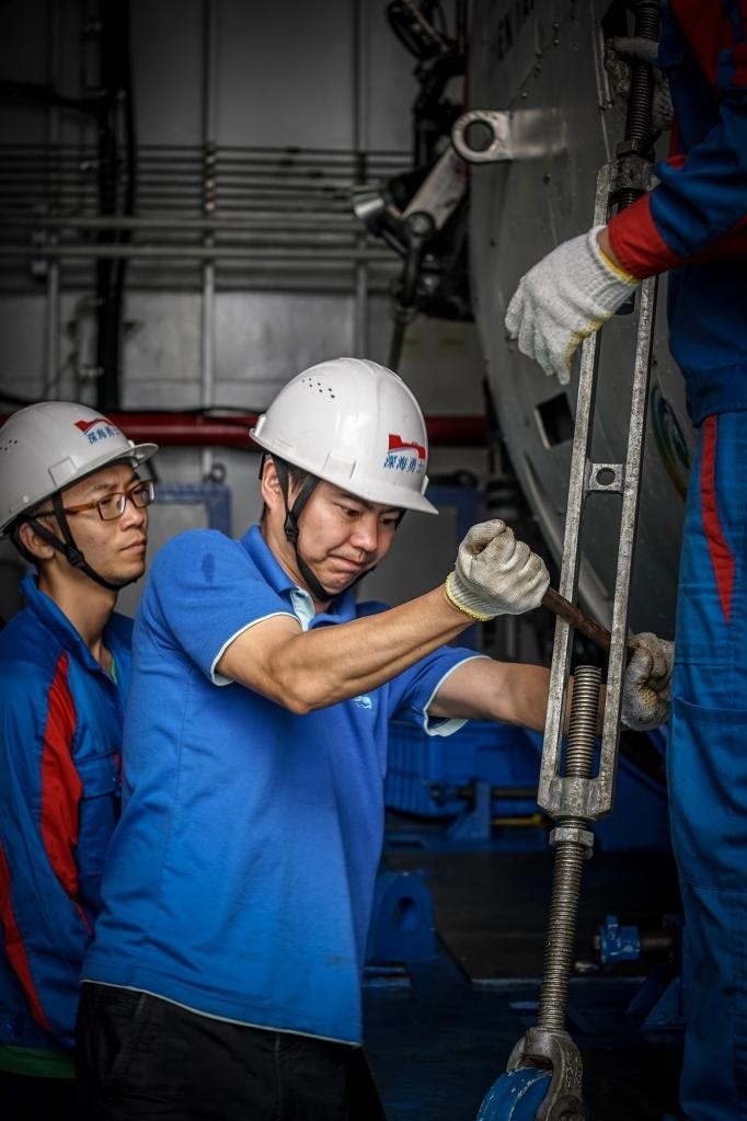 圖為楊申申(中)在海上試驗現(xiàn)場忙碌工作。