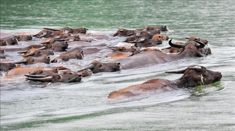 四川南充嘉陵江放牛季活動(dòng)啟幕,上演“百牛渡江”場面。