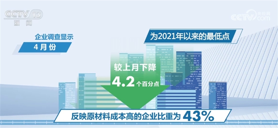 今年以來,原材料成本、物流和勞動力成本普遍回落。企業(yè)調(diào)查顯示,4月份反映原材料成本高的企業(yè)比重為43%,較上月下降4.2個百分點,為2021年以來的最低點。反映物流成本高和勞動力成本高的企業(yè)比重分別為27.5%和30%,較上月下降1.9和1.1個百分點。