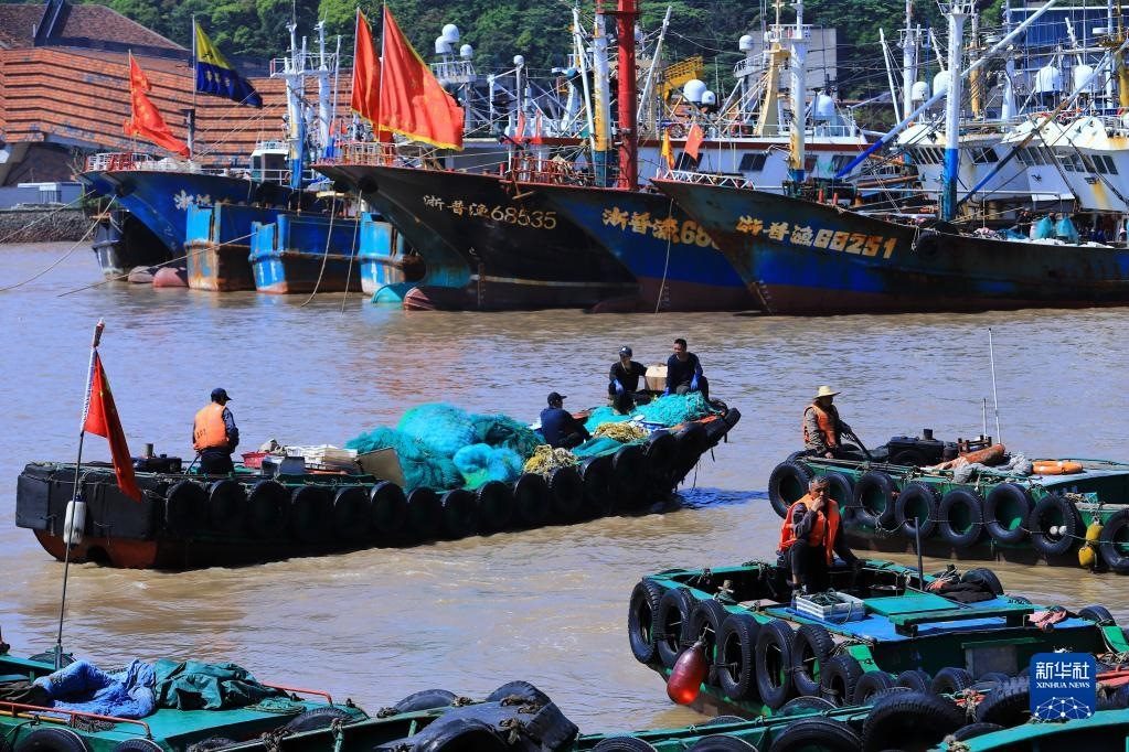 4月30日,浙江省舟山市普陀區(qū)沈家門(mén)漁港內(nèi)的小船將網(wǎng)具和漁民從漁船上送回岸邊。