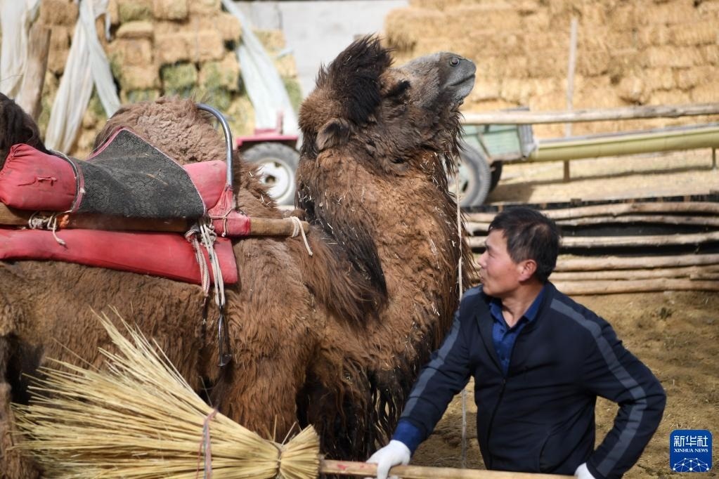 換上景區(qū)工作服的曹文華牽著駱駝準(zhǔn)備“上班”(4月24日攝)。