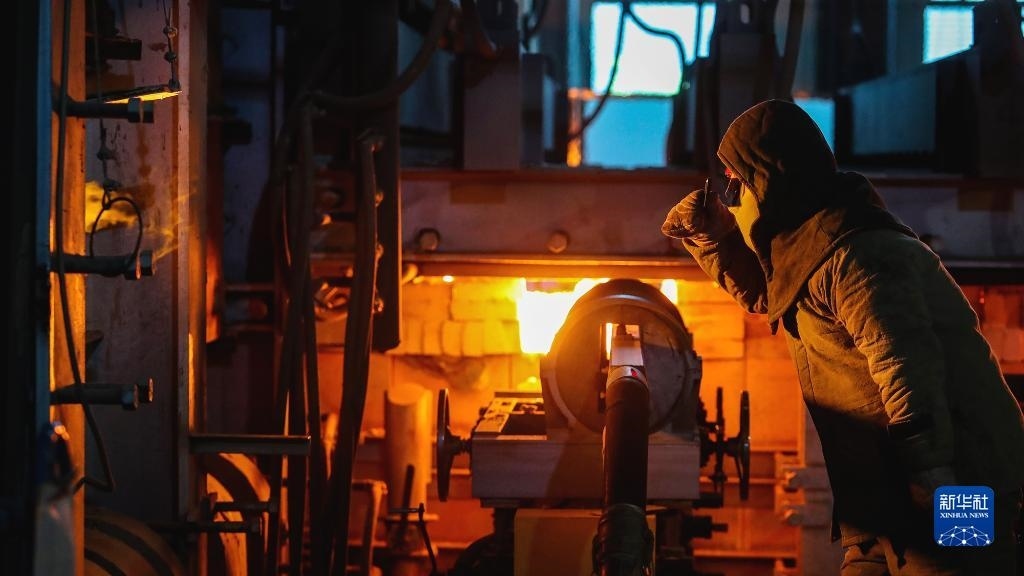 5月1日,在河南省商丘市睢陽(yáng)區(qū)一家玻璃生產(chǎn)企業(yè),工人在車間觀察玻璃液熔制情況。