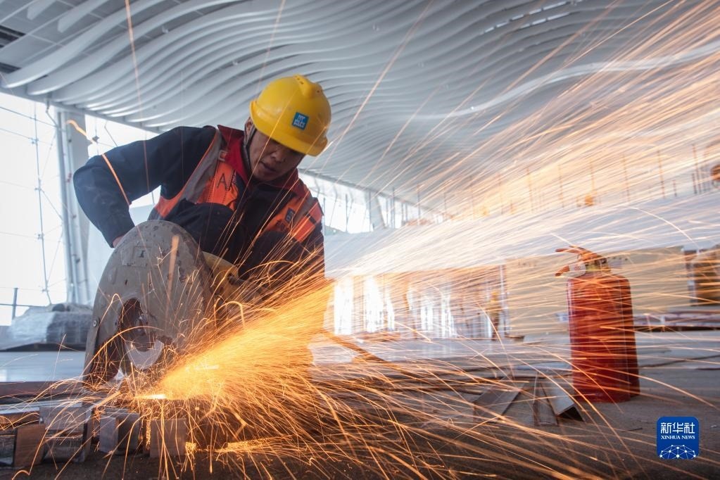 5月1日,在中建三局承建的武漢天河機(jī)場(chǎng)T2航站樓改造工程項(xiàng)目工地,工人在切割材料。