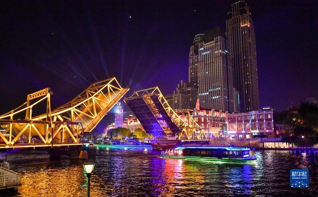 5月1日晚,位于天津海河上的標志性建筑物解放橋橋梁開啟,橋梁開啟角度達到最大角度60度。
