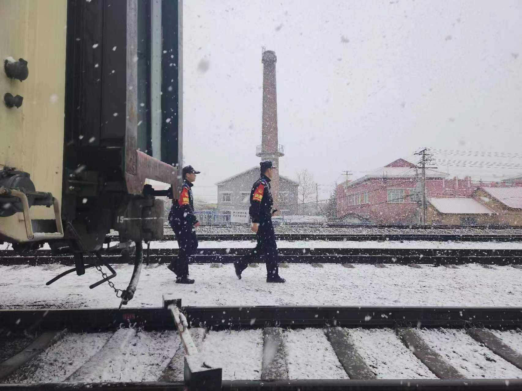 2023年4月30日,內(nèi)蒙古自治區(qū)根河市,海拉爾鐵路公安處根河站派出所民警在風(fēng)雪中巡邏。五一假期,位于大興安嶺深處的根河市迎來降雪天氣,根河站派出所民警在風(fēng)雪中堅(jiān)守工作崗位,確保旅客出行安全。 張磊 攝