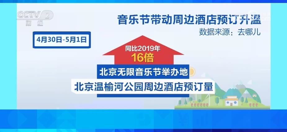 4月29日—5月1日,北京草莓音樂節(jié)舉辦地延慶世園公園周邊的酒店預(yù)訂量,同比2019年增長18倍。4月30日—5月1日,北京無限音樂節(jié)舉辦地北京溫榆河公園周邊酒店預(yù)訂量,同比2019年增長16倍。