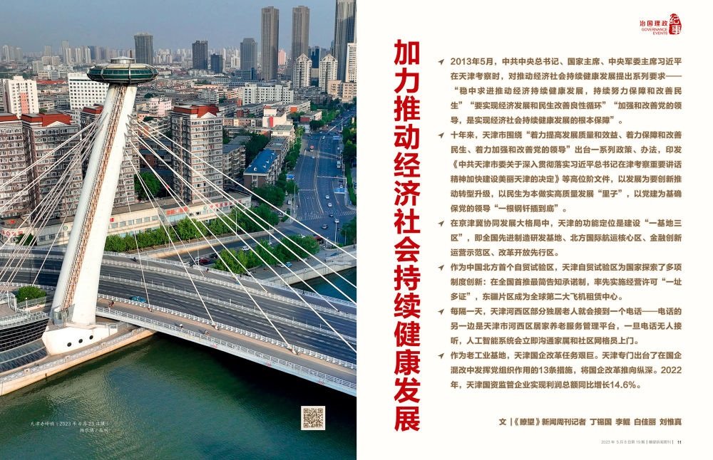 時(shí)光回到十年前。2013年5月,中共中央總書(shū)記、國(guó)家主席、中央軍委主席習(xí)近平在天津考察時(shí),對(duì)推動(dòng)經(jīng)濟(jì)社會(huì)持續(xù)健康發(fā)展提出系列要求——“穩(wěn)中求進(jìn)推動(dòng)經(jīng)濟(jì)持續(xù)健康發(fā)展,持續(xù)努力保障和改善民生”“要實(shí)現(xiàn)經(jīng)濟(jì)發(fā)展和民生改善良性循環(huán)”“加強(qiáng)和改善黨的領(lǐng)導(dǎo),是實(shí)現(xiàn)經(jīng)濟(jì)社會(huì)持續(xù)健康發(fā)展的根本保障”。