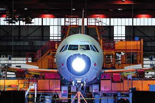 空客天津總裝線(xiàn)的首架空客 A321 飛機(jī)上線(xiàn)開(kāi)始總裝(2022 年 11 月 9 日攝)趙子碩攝 / 本刊