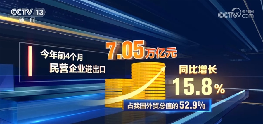 海關(guān)統(tǒng)計顯示,今年前4個月,民營企業(yè)進出口7.05萬億元,同比增長15.8%,占我國外貿(mào)總值的52.9%。