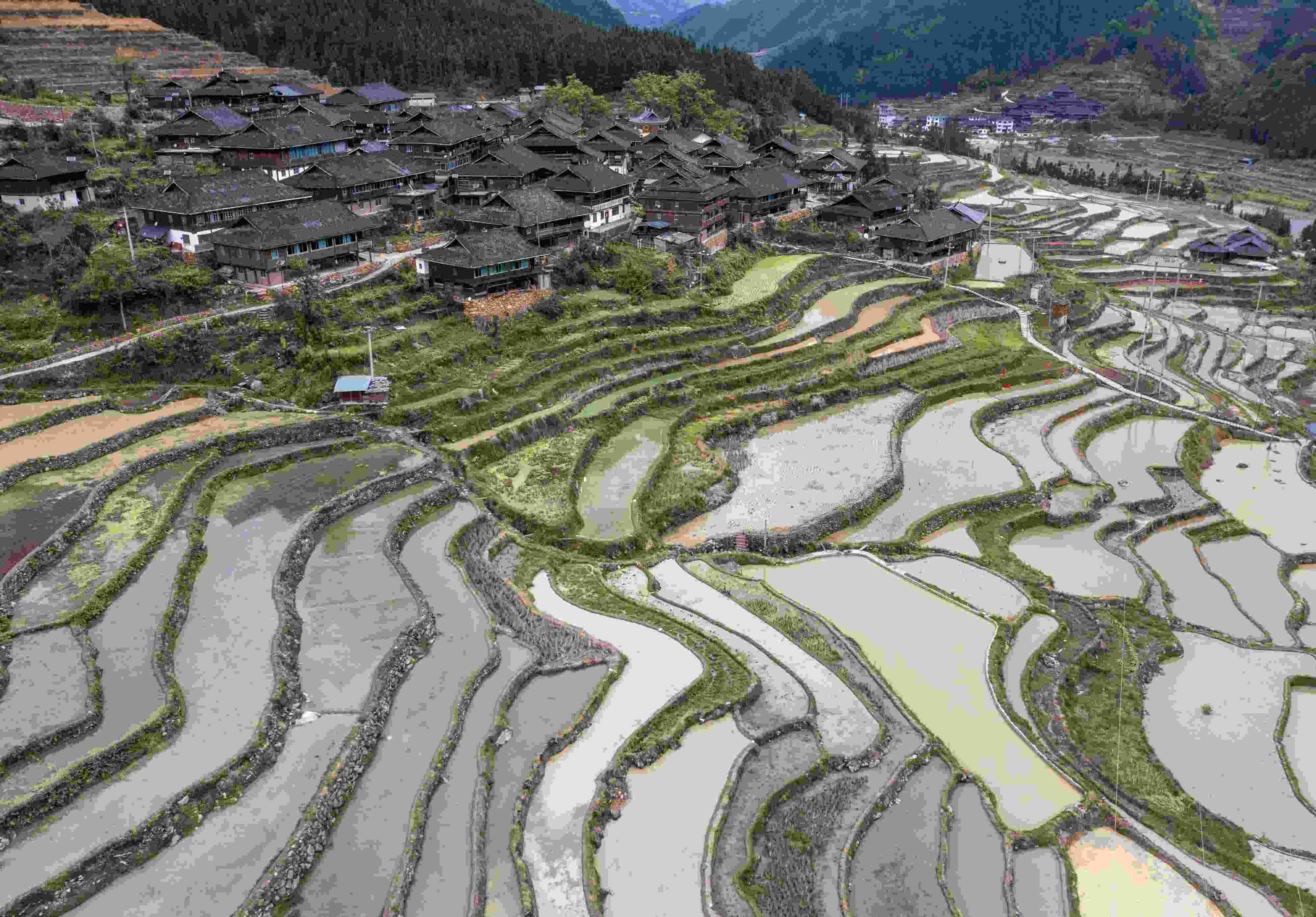 2023年5月7日,貴州省黔東南苗族侗族自治州,從江縣剛邊壯族鄉(xiāng)境內(nèi)田園生機(jī)勃勃,翻耕后的層層梯田和青山、河流、村落相映成趣,構(gòu)成一幅鄉(xiāng)村美景圖畫。