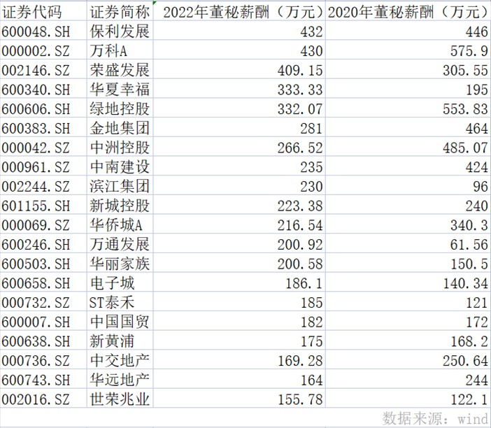 同樣,房企董秘薪酬也下滑,2022年A股上市房企中,薪酬排名前20的董秘平均年薪為250萬(wàn)元,較2020年的326萬(wàn)元,下降23.3%。