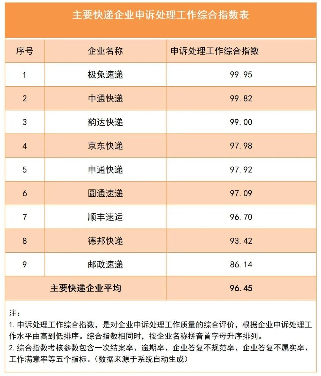 主要快遞企業(yè)申訴處理工作綜合指數平均為96.45,高于平均值的有7家,低于平均值的有2家。