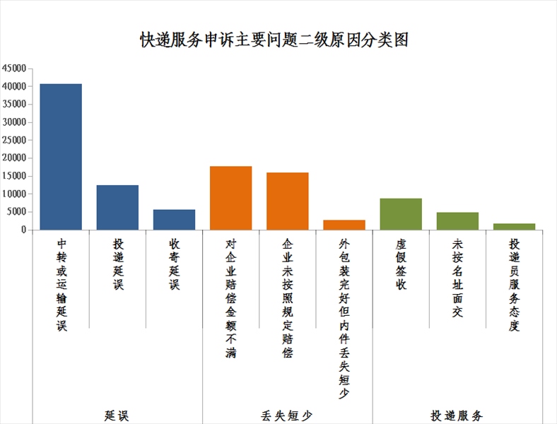 2.快遞服務申訴主要問題二級原因情況。快件延誤申訴中主要占比較多的是中轉或運輸延誤,快件丟失短少申訴中主要占比較多的是對企業(yè)賠償金額不滿,投遞服務申訴中主要占比較多的是虛假簽收。