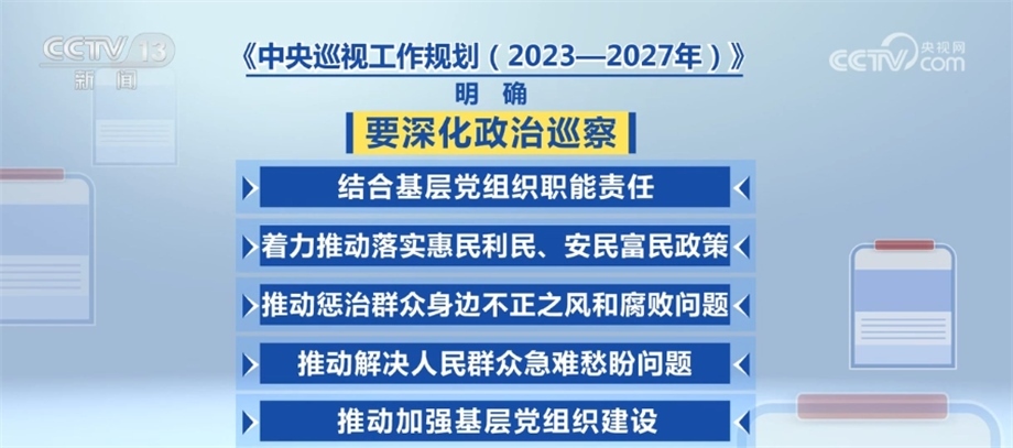 央視網(wǎng)消息:近日,經(jīng)黨中央同意,中共中央辦公廳印發(fā)了《中央巡視工作規(guī)劃(2023—2027年)》,對(duì)今后5年的巡視工作作出了部署。一屆任期內(nèi)實(shí)現(xiàn)巡視全覆蓋,是黨章規(guī)定的政治任務(wù)。通過(guò)什么樣的方式實(shí)現(xiàn)二十屆中央巡視全覆蓋?采取哪些措施高質(zhì)量推進(jìn)巡視全覆蓋?在此次印發(fā)的巡視工作規(guī)劃中都作出了要求。