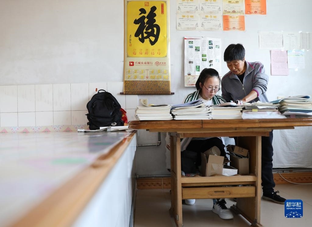 張連琴(右)和女兒在交流學(xué)校布置的作文(5月7日攝)。