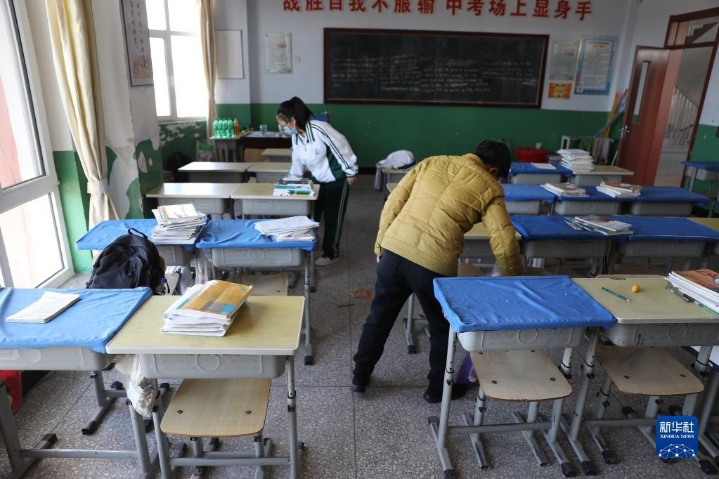 清晨,張連琴和女兒第一個來到教室,打掃衛(wèi)生。這是母女倆多年來每天到校必做的一件事(5月8日攝)。