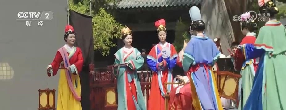 在晉祠的標志性建筑圣母殿前,一場場穿越古今的表演登臺亮相?!稌x祠十二時辰》由晉祠講解員自行編排而成,生動還原了圣母殿內(nèi)人物的一天。從服飾裝扮到生活起居,她們用舞蹈讓雕塑“活”了起來,也使游客從別樣的角度領略了圣母殿折射出的文化魅力。