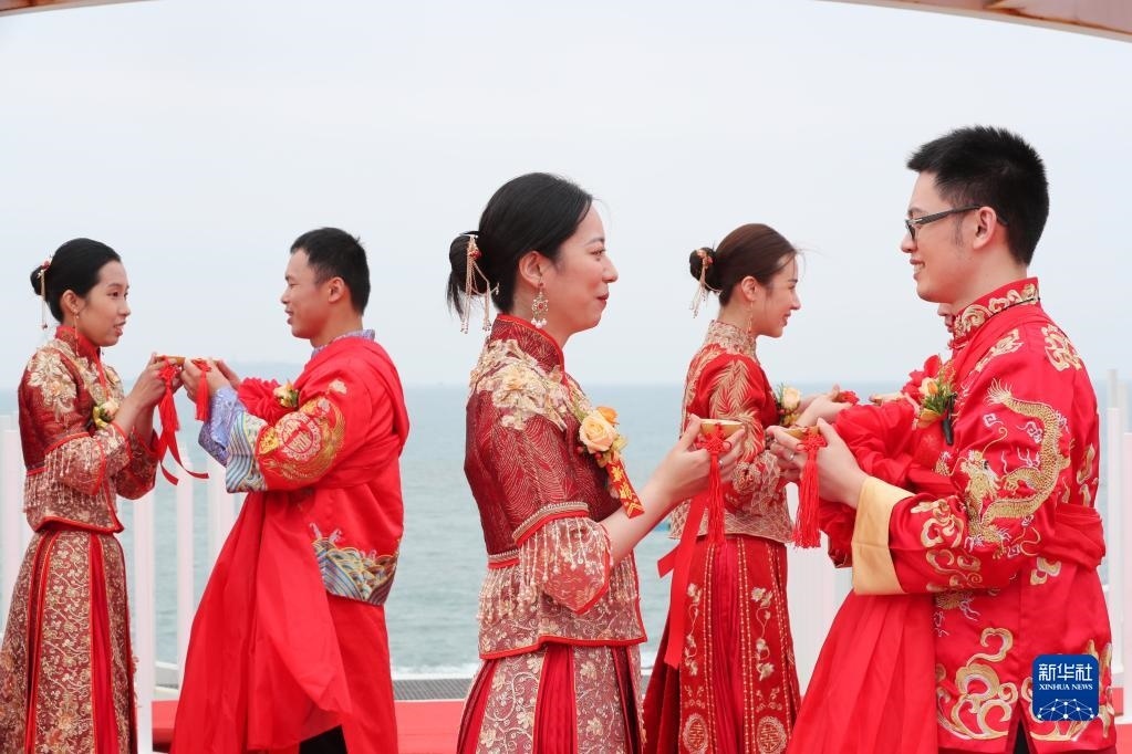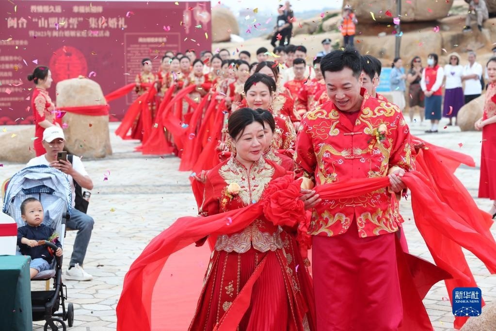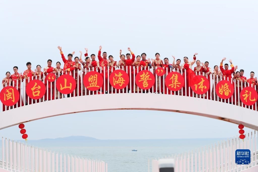 當(dāng)日,一場以“愛情恒久遠(yuǎn)、幸福長相伴”為主題的閩臺“山盟海誓”集體婚禮暨2023年閩臺婚姻家庭交流活動在福建省福州市平潭縣舉辦。21對閩臺新人身穿紅色中式婚服,手牽紅繡球,行跨火盆、踩瓦片、扎繡球和“合茶”、“合巹”、“海誓”等閩臺傳統(tǒng)結(jié)婚禮儀,結(jié)下跨越海峽的姻緣。