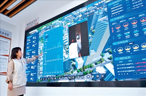 福建省福州市鼓樓區(qū)是國家智能社會治理綜合實(shí)驗(yàn)基地,社區(qū)工作者在鼓樓區(qū)鼓東街道中山社區(qū)介紹“智慧社區(qū)”建設(shè)情況(2023年4月25日攝)林善傳攝/本刊