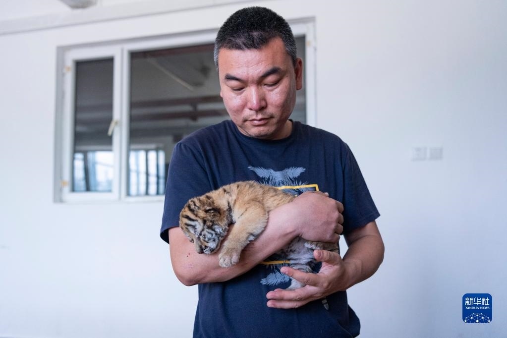 5月22日,在黑龍江東北虎林園的虎舍中,飼養(yǎng)員查看東北虎幼崽生長狀況。