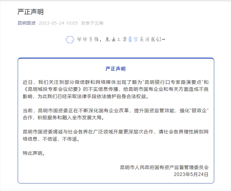 ·昆明市國(guó)資委發(fā)布聲明,“昆明銀行口專(zhuān)家路演要點(diǎn)”和《昆明城投專(zhuān)家會(huì)議紀(jì)要》不實(shí)。