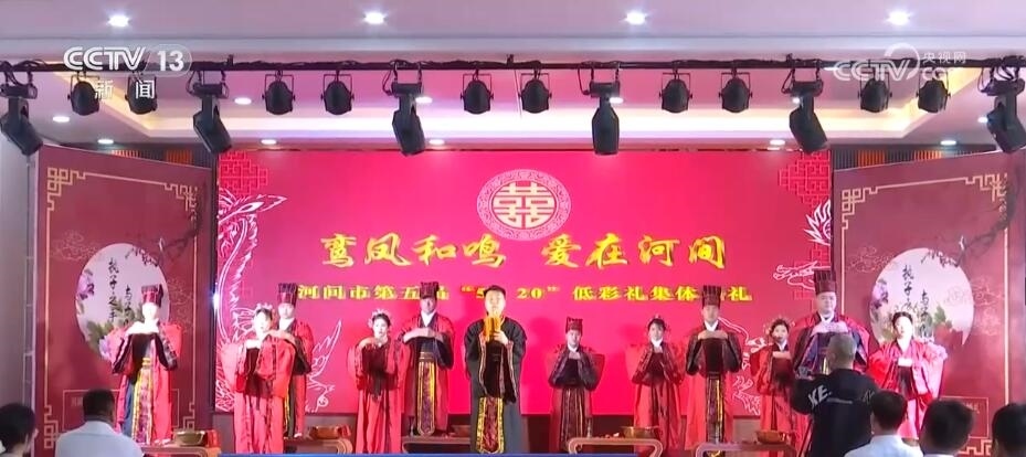 在江西貴溪、山東巨野等地,五月份組織了多場(chǎng)主題為“不要彩禮要幸福”的集體婚禮,倡導(dǎo)新人們選擇簡(jiǎn)約的婚禮儀式。在河北省河間市的集體婚禮現(xiàn)場(chǎng),紅毯艷艷、絲竹裊裊,新人們身著傳統(tǒng)禮服,在證婚人、主婚人的見(jiàn)證下,按照周制漢婚的傳統(tǒng)儀式開(kāi)啟他們愛(ài)的旅程。
